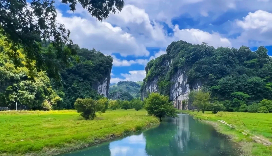 湄江的地質(zhì)奇觀令人嘆為觀止。蜿蜒的湄水如玉帶般穿梭于崇山峻嶺之間,兩岸百丈高崖直插云霄,形成綿延十里的峭壁畫廊。這里的巖溶地貌發(fā)育之完整堪稱教科書級(jí)別:從幼年期的溶溝石芽,到中年期的峰林峽谷,再到晚年期的孤峰殘丘,完整呈現(xiàn)了巖溶地貌的生命周期。
