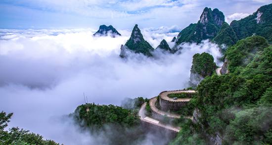 天門山景區(qū)有兩大人文奇觀,即天門山索道和天門山盤山公路。